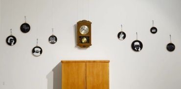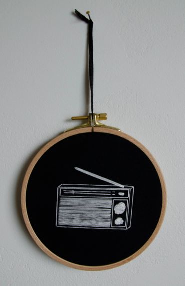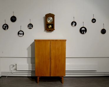 recycled textiles, embroideryhoops, Mouliné Cotton threads, pendulum clock, cupboard, voice